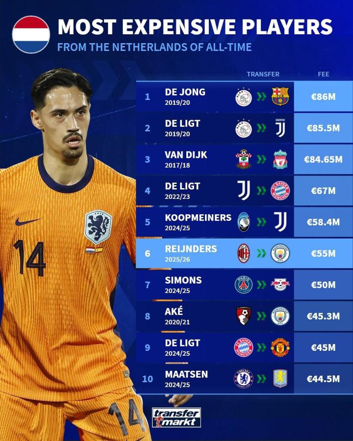 北京时间6月11日,曼城正式宣布签下赖因德斯,根据此前的报道,这笔交易的固定转会费为5500万欧元,根据统计,这是荷兰球员转会费第6高的交易。