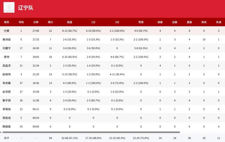 辽宁男篮赵继伟14分5助,高诗岩7分10助,付豪22分,原帅18分;