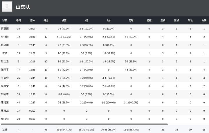 山东男篮王岚嵚11分5助,李祥波17分4助,张新宇10分。