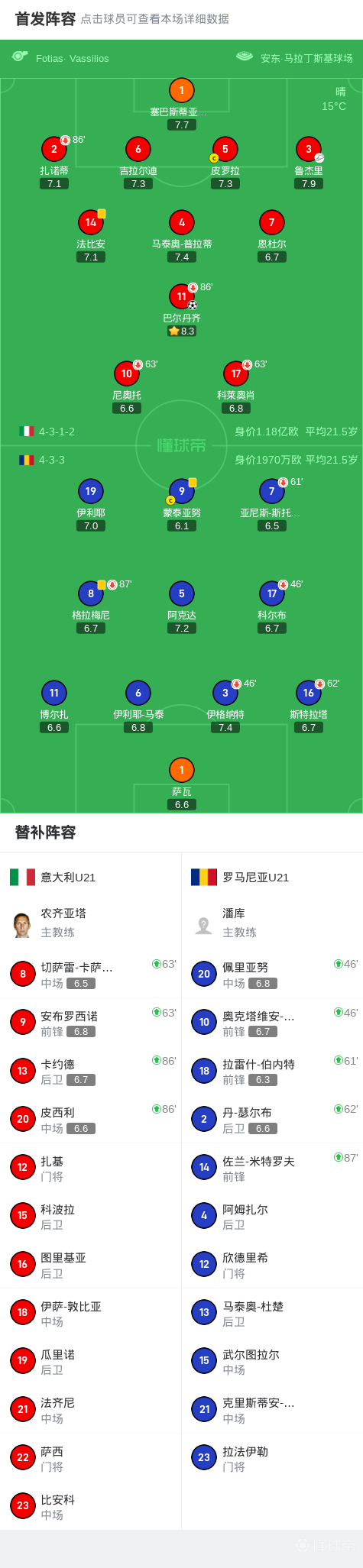 北京时间6月12日欧洲U21国家杯 小组赛 第1轮,意大利U21对阵罗马尼亚U21。意大利U21巴尔丹齐破门。最终比分意大利U21 1-0 罗马尼亚U21。