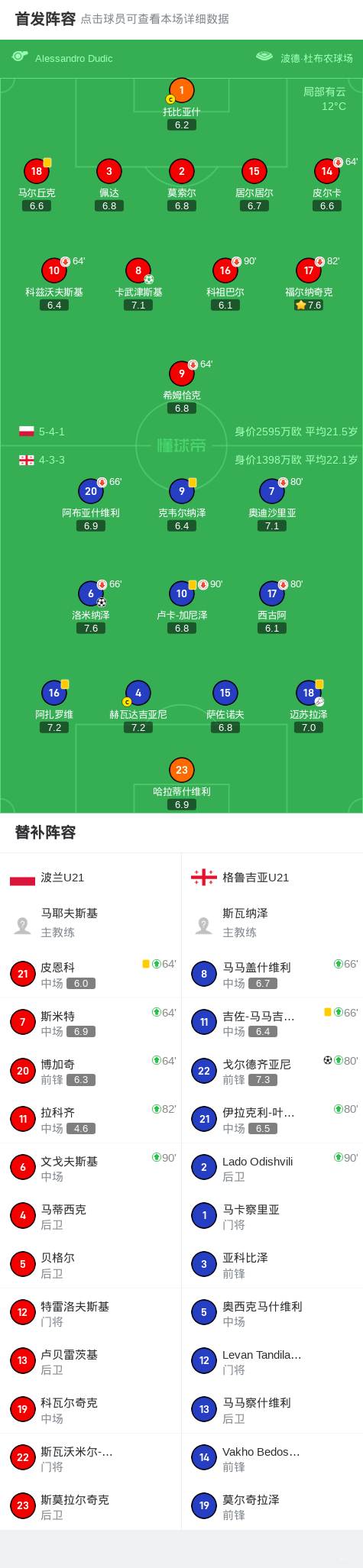 北京时间6月12日,欧洲U21国家杯小组赛第1轮,波兰U21与格鲁吉亚U21展开较量。比赛中,格鲁吉亚U21由洛米纳泽率先建功,取得领先。随后,波兰U21凭借卡武津斯基的点球破门扳平比分。比赛尾声阶段,格鲁吉亚U21通过迈苏拉泽的助攻,由戈尔德齐亚尼完成进球,再次超出比分。最终,波兰U21以1-2不敌格鲁吉亚U21。