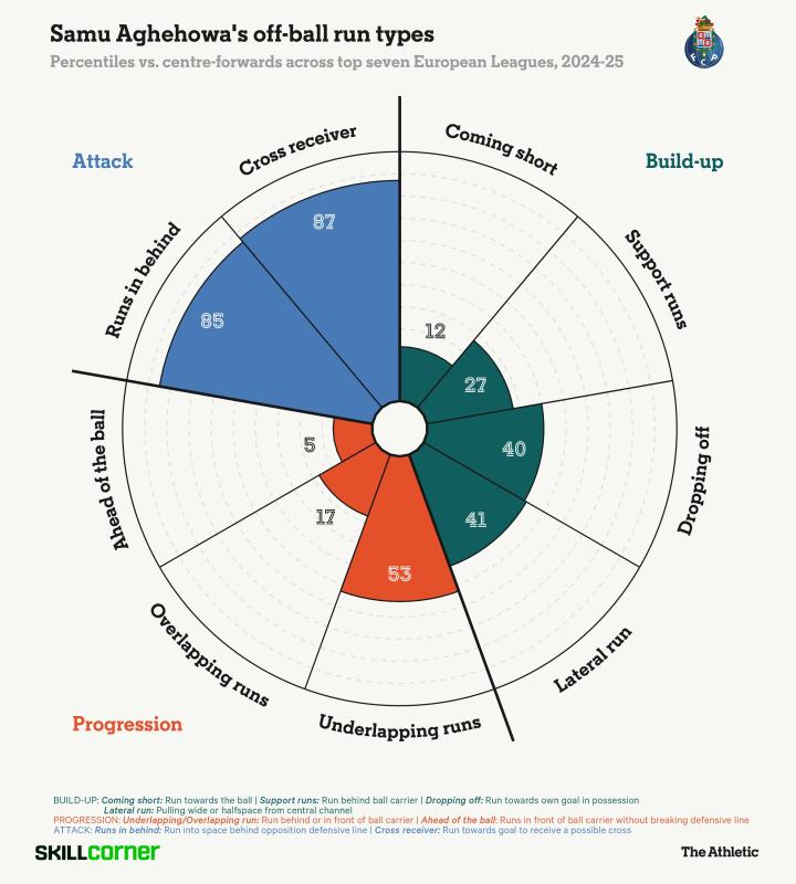 这些进球展现了他全面的射术:禁区内的嗅觉(如十月巨龙球场3-3战平曼联时那记扳平比分的灵巧头槌)、反击中的冷静、后点包抄甚至倒挂金钩。远离球门时,阿赫霍瓦193cm的伟岸身躯总能巧妙扛住防守,时而以突然加速完成转身,时而以精准传球串联进攻。但贯穿始终的,是他作为现代九号中锋的核心竞争力,强劲的冲击力、简洁直接的风格和对进球的渴望。那些直插防线身后的冲刺,正是撕破防线的致命武器。
