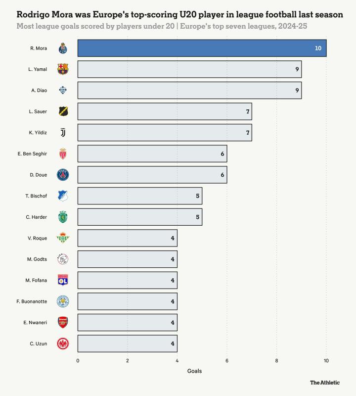 这般描述或令人联想到传统边锋,但莫拉的角色实则更为多元。他固然能驰骋边路,却更享受内切深入敌阵制造混乱。这位攻击手不仅创造机会,更能高效终结:以赛季10粒联赛进球收官,平均每139分钟斩获一球的数据在波尔图2024-25赛季整体低迷的背景下更显珍贵。