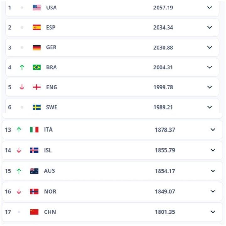FIFA最新女足排名:中国女足不变,仍排名世界第17,亚洲第4HaLonzoB @懂球帝2025-06-12 16:50北京时间6月12日,FIFA官方公布了最新一期的女足世界排名,中国女足排名不变,排在世界第17位,在亚足联排名第4位。FIFA女足世界排名1.美国女足2.西班牙女足3.德国女足4.巴西女足5.英格兰女足6.瑞典女足7.日本女足8.加拿大女足9.朝鲜女足10.法国女足15.澳大利亚女足17.中国女足展开更多