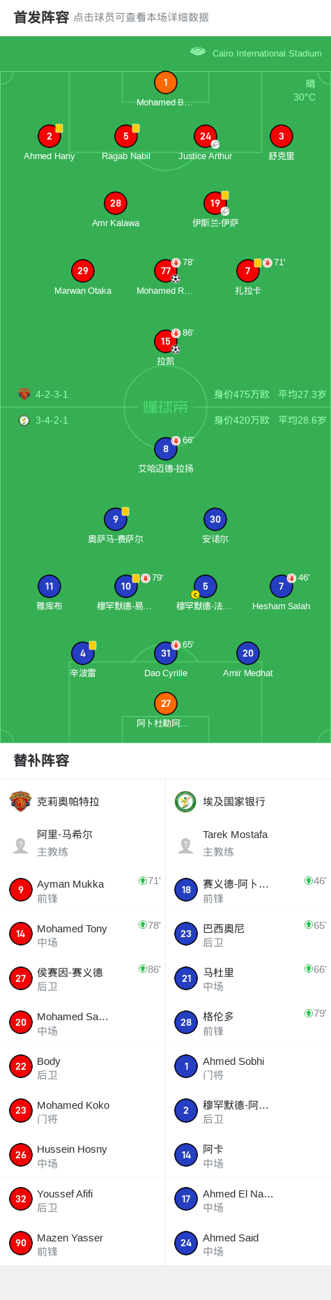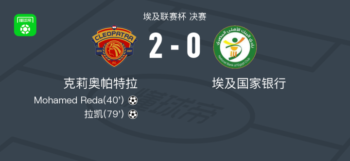 克莉奥帕特拉2-0埃及国家银行,Mohamed Reda建功,拉凯锁定胜局战报bot2025-06-13 03:28北京时间6月13日埃及联赛杯 决赛,克莉奥帕特拉对阵埃及国家银行。克莉奥帕特拉Mohamed Reda破门,拉凯破门。最终比分克莉奥帕特拉 2-0 埃及国家银行。点击查看本场比赛详细数据>>精彩瞬间第40分钟,克莉奥帕特拉球员Justice Arthur助攻Mohamed Reda打入一球。第79分钟,克莉奥帕特拉球员伊斯兰-伊萨助攻拉凯打入一球。 球队阵容 技术统计 展开更多