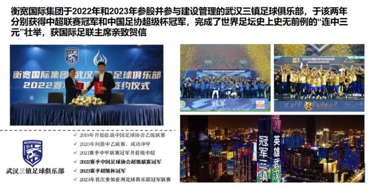 公告中写道:衡宽国际集团曾深度参与中国足球事业,依据协议约定于2022年及2023年成为武汉三镇足球俱乐部的实际股东,并委派董事王芳女士出任俱乐部董事长,深度参与运营管理。此期间,俱乐部于2022年荣膺中超联赛冠军、2023年夺得中国足协超级杯冠军。武汉三镇足球俱乐部于2020年至2022年连续夺得中乙、中甲、中超冠军,成就世界足坛史无前例的“连中三元”壮举,亦为湖北省建国以来首个夺得男子足球顶级联赛(中超)冠军的俱乐部,获国际足联主席亲致贺信。2022年12月31日,武汉市两江四岸亮起武汉三镇冠军主题灯光秀,成为湖北省年度标志性事件。