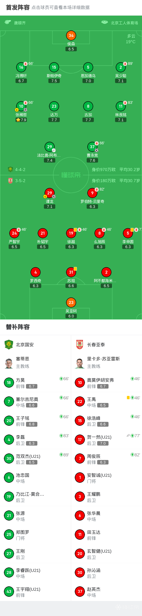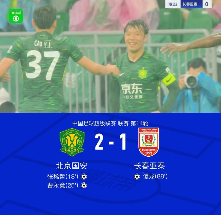 北京时间6月14日19:00,中超第14轮,北京国安主场迎战长春亚泰。上半场比赛中,吴亚轲出球失误,张稀哲冷静破门,随后曹永竞再下一城扩大领先优势;下半场,谭龙终场前打入一球扳回一分,贝里奇伤退。最终,北京国安以2-1战胜长春亚泰。