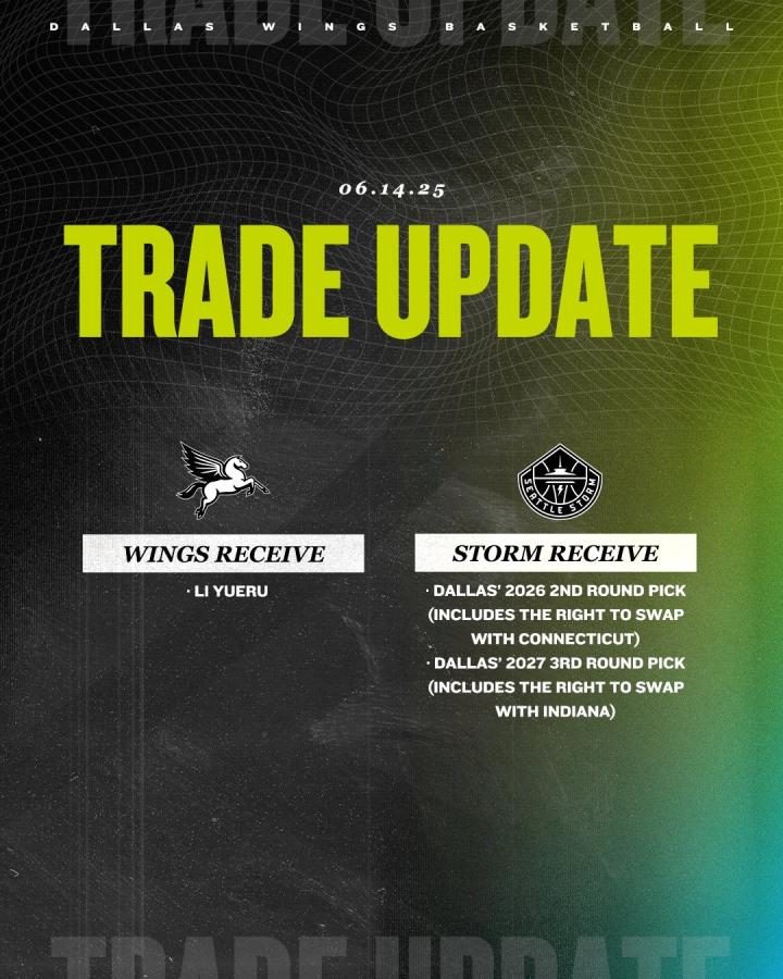 达拉斯飞翼官方宣布:达拉斯飞翼队用两个未来选秀权从西雅图风暴队手中换取中锋李月汝。