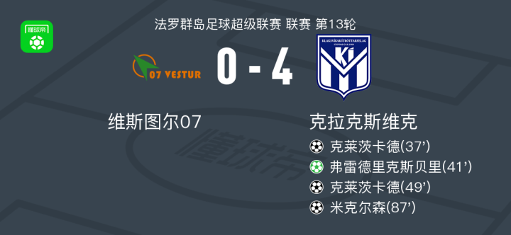 北京时间6月14日,法罗群岛足球超级联赛第13轮展开争夺,维斯图尔07主场迎战克拉克斯维克。比赛中,克拉克斯维克展现出强大攻势,克莱茨卡德在队友弗雷德里克斯贝里的助攻下首开纪录,并完成梅开二度。随后,弗雷德里克斯贝里通过点球扩大领先优势。此外,米克尔森接弗雷德里克斯贝里的再度助攻打入一球,为球队锦上添花。最终,克拉克斯维克以4-0的比分战胜维斯图尔07,全取三分。