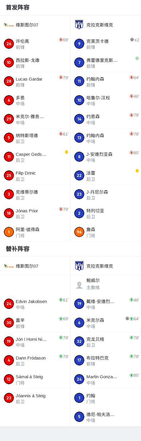 第87分钟,克拉克斯维克球员弗雷德里克斯贝里助攻米克尔森打入一球。