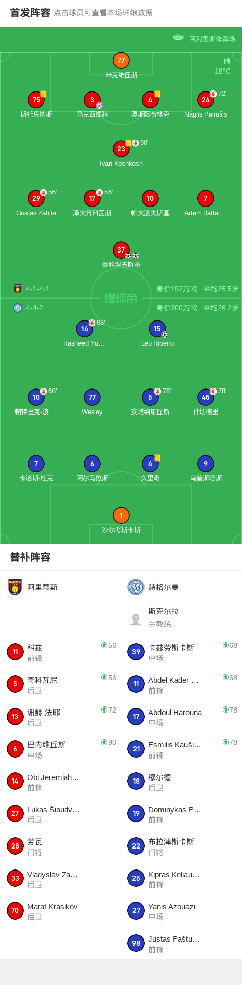 第67分钟,阿里蒂斯球员奥科涅夫斯基打入一球。