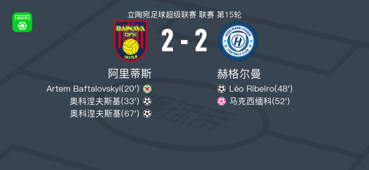 在北京时间6月15日进行的立陶宛足球超级联赛第15轮比赛中,阿里蒂斯主场迎战赫格尔曼。比赛开始后,阿里蒂斯获得点球机会但未能罚入。随后,奥科涅夫斯基为阿里蒂斯首开纪录。赫格尔曼迅速由Léo Ribeiro扳平比分。然而,马克西缅科不慎将球送入自家球门,让赫格尔曼一度反超。关键时刻,奥科涅夫斯基再次挺身而出,帮助阿里蒂斯再度追平比分。最终,双方以2-2握手言和。