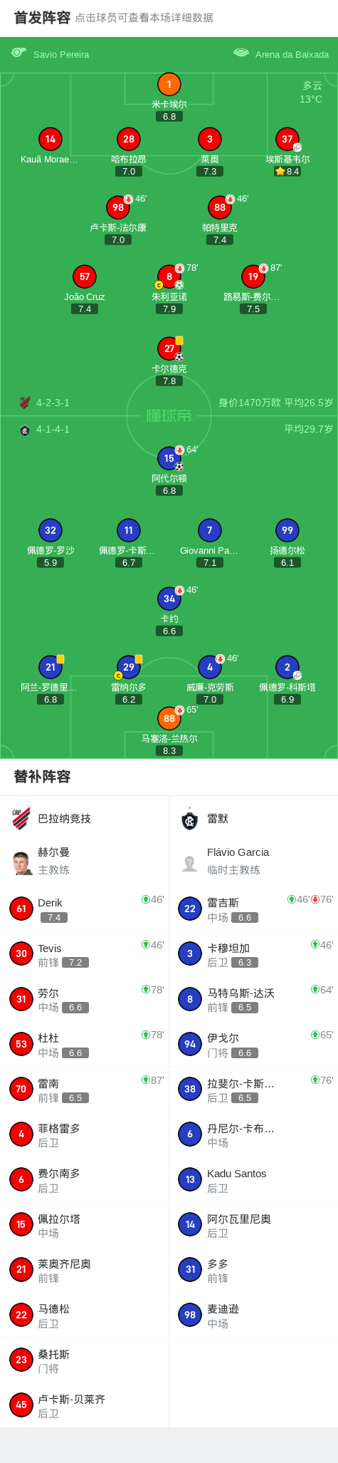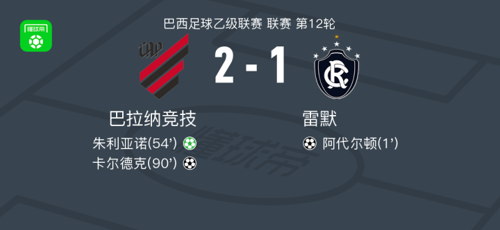 北京时间6月15日,巴西足球乙级联赛第12轮,巴拉纳竞技主场迎战雷默。比赛中,雷默凭借阿代尔顿的进球取得领先。随后,巴拉纳竞技通过朱利亚诺罚入的点球扳平比分。比赛尾声,卡尔德克接埃斯基韦尔的助攻打入制胜一球。最终,巴拉纳竞技以2-1战胜雷默。