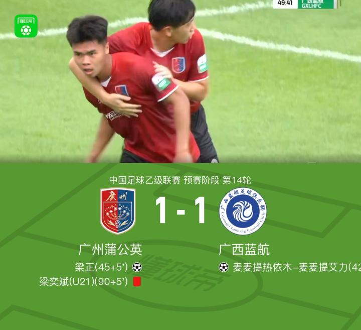 北京时间6月15日,中国足球乙级联赛预赛阶段第14轮,广州蒲公英主场迎战广西蓝航。比赛中,广西蓝航由麦麦提热依木-麦麦提艾力攻入一球,广州蒲公英则依靠梁正的进球扳平比分。最终,双方以1-1战平。此外,广州蒲公英的一名队员在比赛尾声阶段因领到红牌被罚出场。