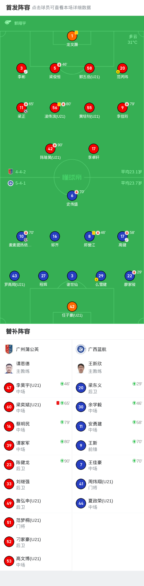 十人广州蒲公英1-1广西蓝航两轮不胜,梁奕斌肘击染红