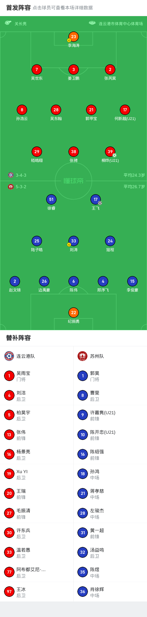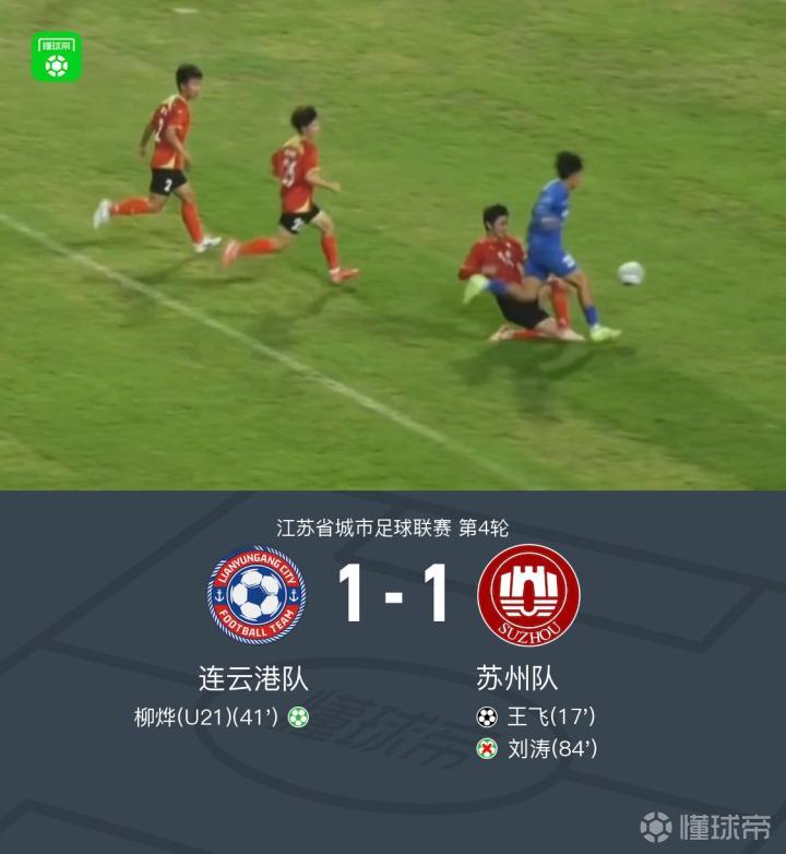 北京时间6月15日,江苏省城市足球联赛第4轮,连云港队主场迎战苏州队。上半场赵文锦倒三角,王飞破门,之后吴东翰造点,柳烨主罚命中扳平比分。下半场刘涛将点球打在门框上弹出,补时最后时刻陈伟补射破门,但裁判示意此前队友越位,进球无效。最终,双方以1-1的比分握手言和。