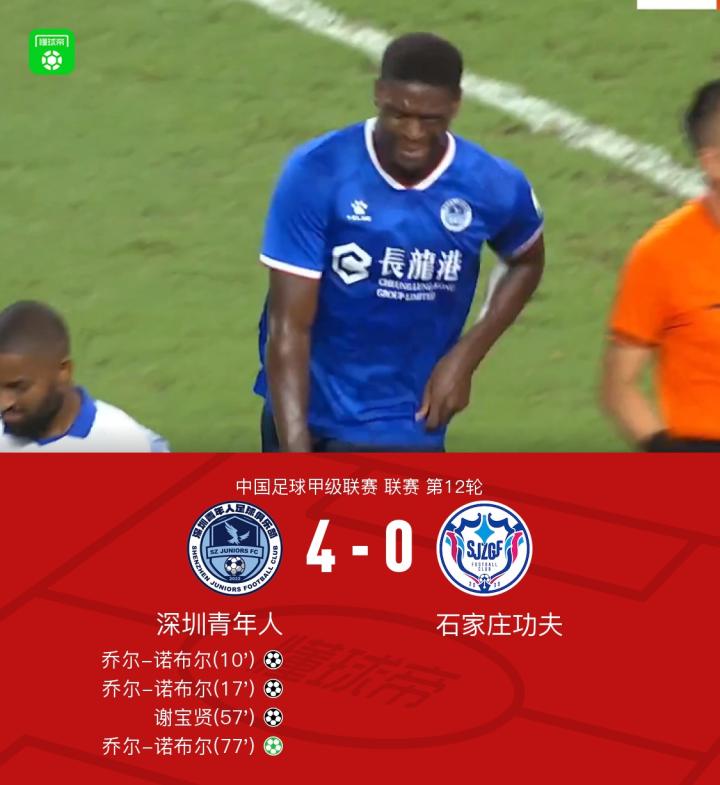 北京时间6月15日,中国足球甲级联赛第12轮,深圳青年人主场迎战石家庄功夫。比赛中,深圳青年人的乔尔-诺布尔表现出色,不仅完成帽子戏法,还助攻谢宝贤打入一球。最终,深圳青年人以4-0战胜石家庄功夫。