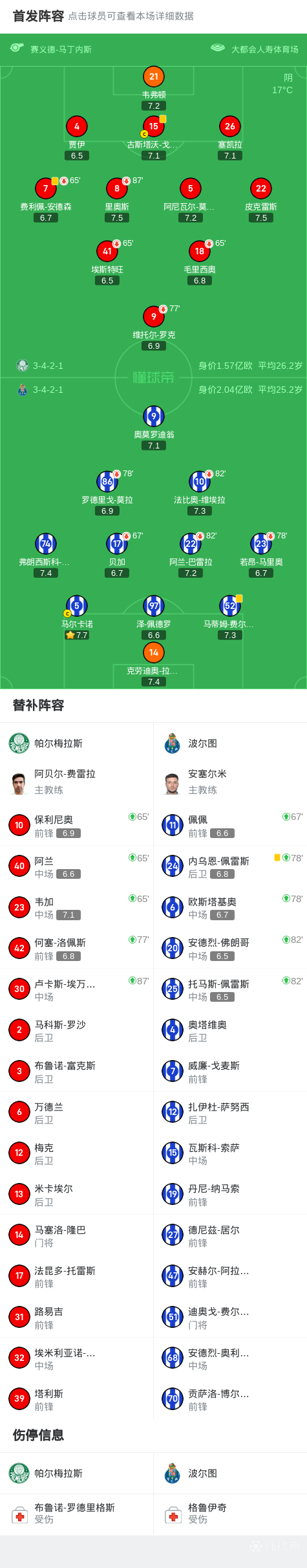 波尔图0-0帕尔梅拉斯,门将拉莫斯神奇两连扑,塞凯拉中柱战报bot @懂球帝2025-06-16 07:55北京时间6月16日国际足联世界俱乐部杯小组赛第1轮,帕尔梅拉斯对阵波尔图。上半场,波尔图门将拉莫斯神奇两连扑力保球门不失。下半场,塞凯拉头球攻门击中立柱弹出。全场比赛结束,波尔图0-0战平帕尔梅拉斯。点击查看本场比赛详细数据>>点击查看世俱杯完整积分榜>>球队阵容技术统计展开更多