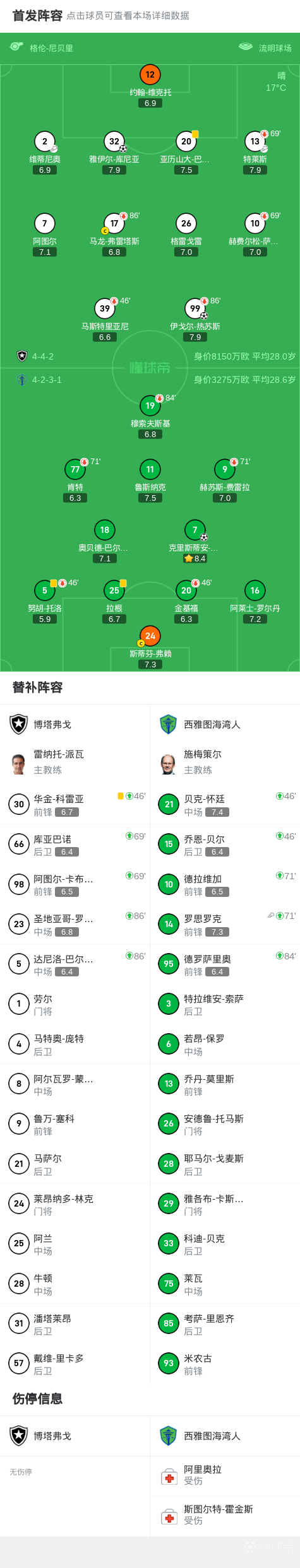 博塔弗戈2-1西雅图海湾人,雅伊尔-库尼亚、伊戈尔-热苏斯破门