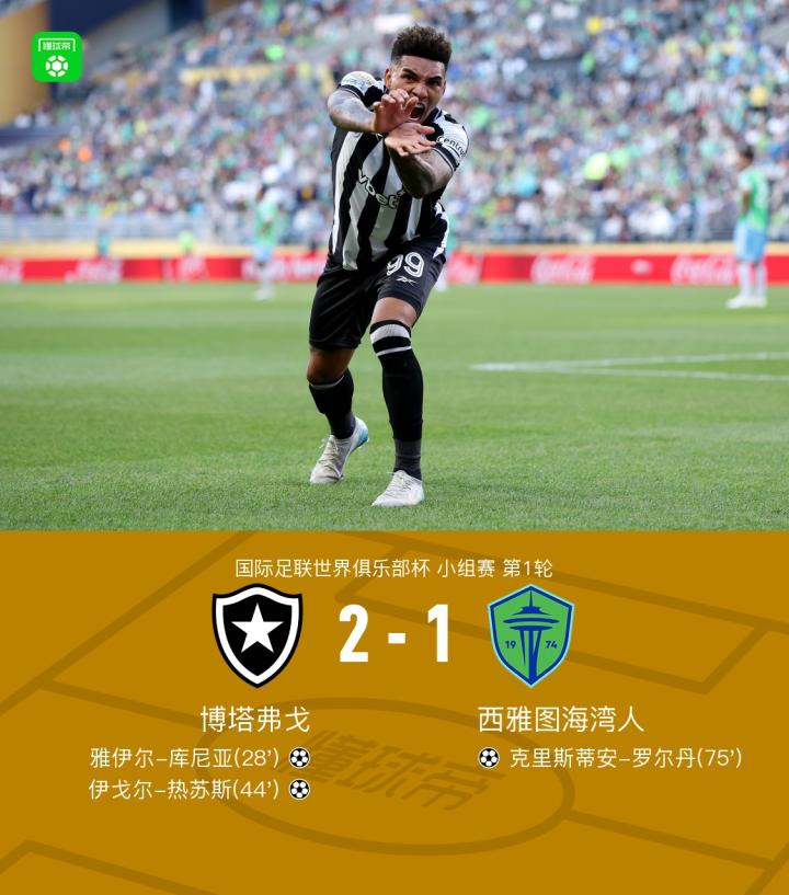 北京时间6月16日国际足联世界俱乐部杯小组赛第1轮,博塔弗戈与西雅图海湾人展开较量。比赛中,博塔弗戈由雅伊尔-库尼亚率先建功,随后伊戈尔-热苏斯扩大领先优势。西雅图海湾人则由克里斯蒂安-罗尔丹追回一球。最终,博塔弗戈以2-1战胜西雅图海湾人。