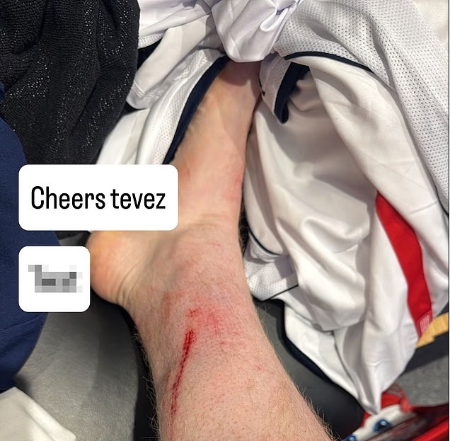 碰撞时,特维斯也显然对金吉“还以颜色”,两人的冲突一度险些演变成真正的扭打。赛后,金吉在社交媒体上分享了一张腿部伤口的照片,并配文:“谢了,特维斯,混蛋。”