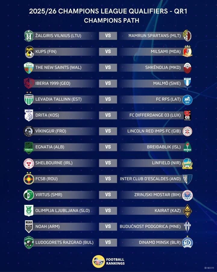 25/26赛季欧冠首轮资格赛抽签结束;两回合比赛将于7月进行