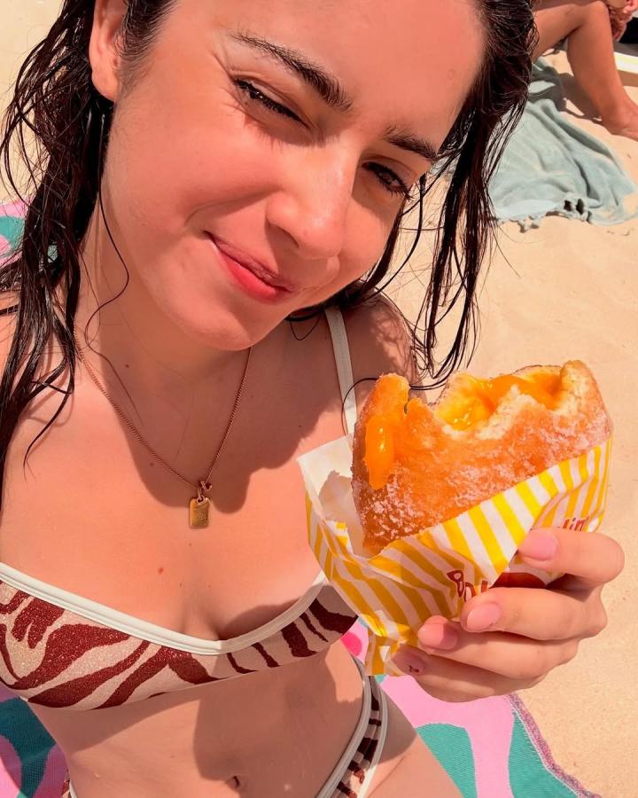 阳光洒在沙滩上,马达莱娜身穿充满野性感的棕白色动物比基尼,刚刚从泳池中出来,头发还带着湿意,皮肤微微晒红,露出了满足而幸福的笑容。她手里拿着一个沾满糖霜夹着金黄蛋奶酱的柏林球,在阳光下显得格外诱人。