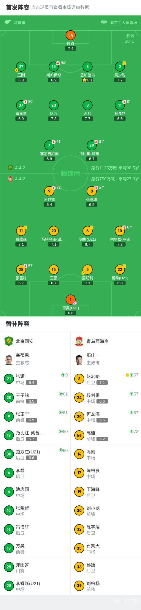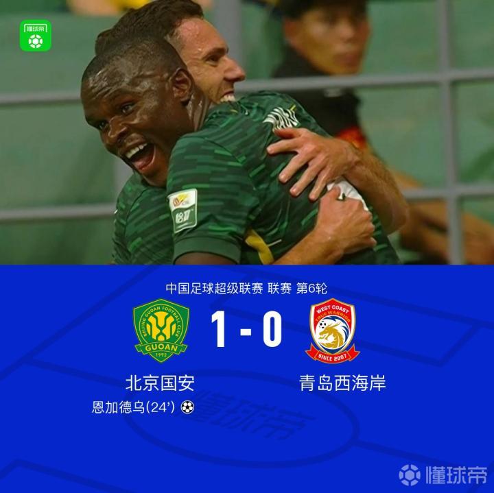 北京时间6月17日19:35,中超第6轮补赛,北京国安坐镇主场北京工人体育场迎战青岛西海岸,本场主裁判为沈寅豪,VAR裁判为刘威。上半场,林良铭开场伤退,恩加德乌头球攻门中柱后反弹到李昊身上弹进球门。下半场,斯帕伊奇伤退。最终,国安主场1-0小胜西海岸,升至中超榜首。