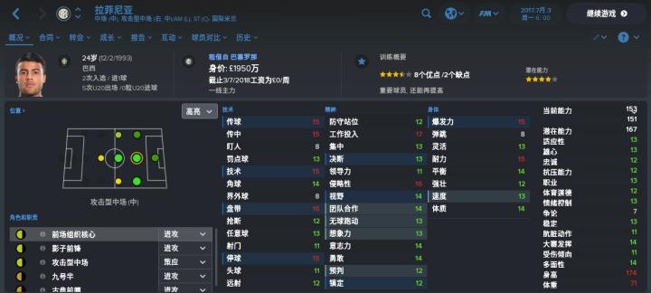 拉菲尼亚是拉玛西亚青训营出品的青年才俊,除了2013-2014赛季曾租借到塞尔塔效力之外,职业生涯都效力于巴塞罗那,此次租借到国际米兰是拉菲尼亚职业生涯第一次离开西甲踢球。从位置上来看,拉菲尼亚比较擅长前腰、右内锋与中前卫的位置,除此之外其他位置也能够胜任,这名左脚将技术比较细腻,融合了巴西足球与西班牙足球的技术特点,但毕竟刚从膝盖的重伤中恢复,能否找回状态有待观察。从CA/PA上看,拉菲尼亚153的CA比较高,这个数值高于国际米兰的大部分球员,而PA167也显示了拉菲尼亚不错的潜力。两次重伤之后仍能拿到这个CA,可见拉菲尼亚的价值。