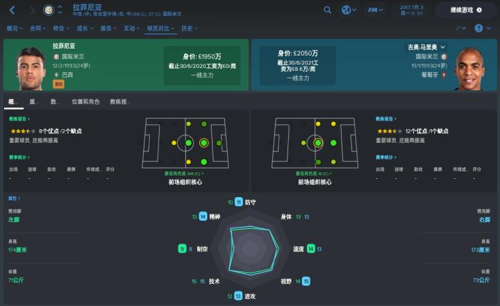 综合来看,两名球员的数据旗鼓相当,他们的CA差距也并不是特别大,但从PA来看拉菲尼亚的上限要稍微高一点。拉菲尼亚在经历两次严重伤病之后还能有如此数据实属不易,马里奥单从属性看是一名好球员,而且精神力方面要比拉菲尼亚更加强大,但或许是战术、适应等各种问题,马里奥明显没有发挥出自己的实力。
