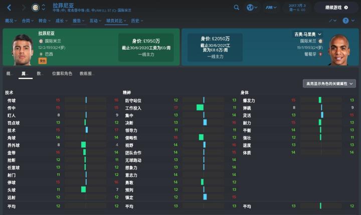 精神属性PK:精神属性中,马里奥的数据要占据上风,14项数据7项领先,最大的优势是决断(16:13),而拉菲尼亚只有3项占优,最大的优势是工作投入(17:11)。