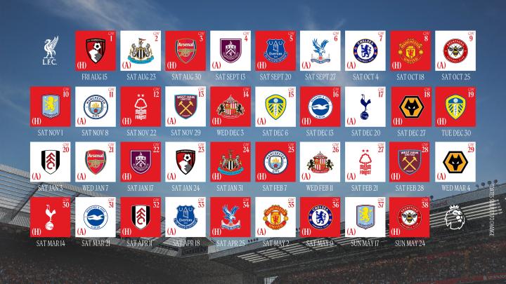 利物浦在本赛季的比赛对阵为: