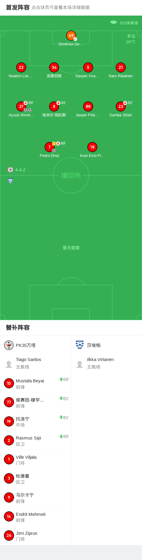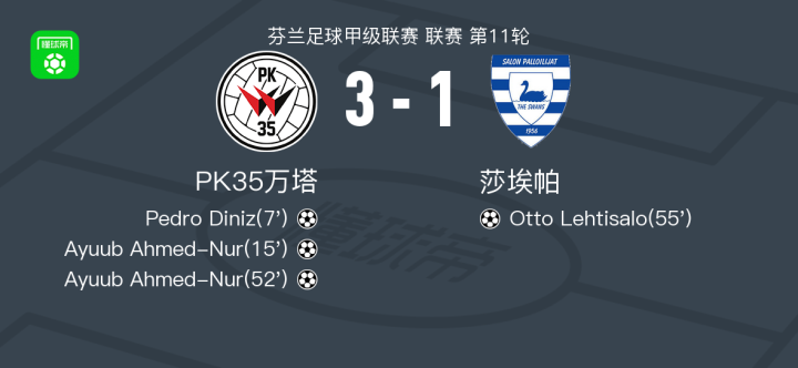 北京时间6月18日,芬兰足球甲级联赛第11轮,PK35万塔主场迎战莎埃帕。比赛中,PK35万塔凭借Pedro Diniz的进球以及Ayuub Ahmed-Nur的梅开二度取得领先优势。莎埃帕方面,Otto Lehtisalo打入一球为球队扳回一分。最终,PK35万塔以3-1战胜莎埃帕。