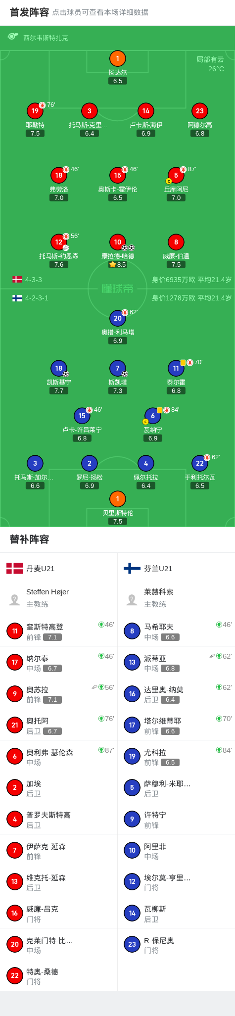 U21丹麦2-2芬兰U21,哈德双响,斯凯塔破门,凯斯基宁绝平