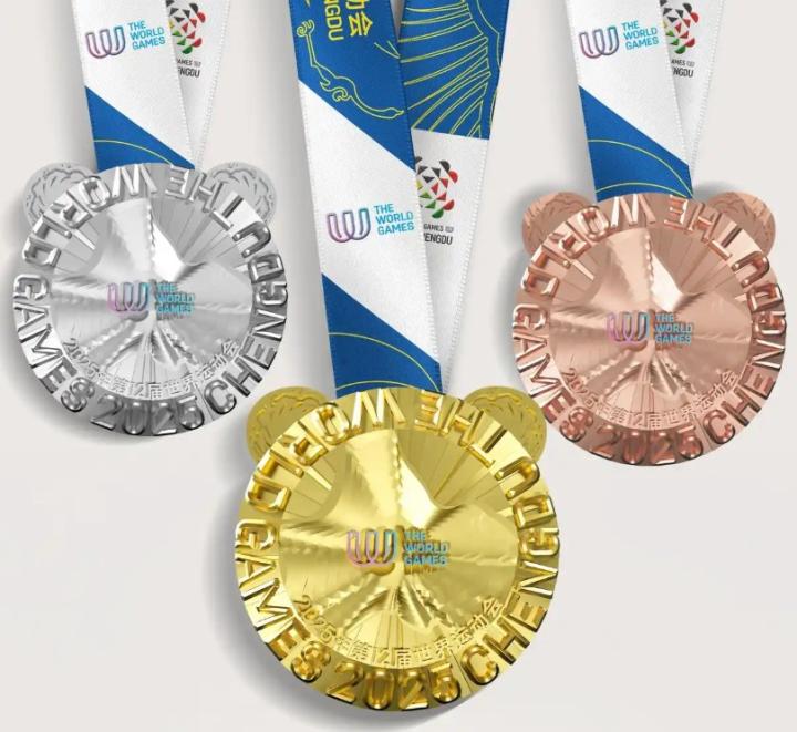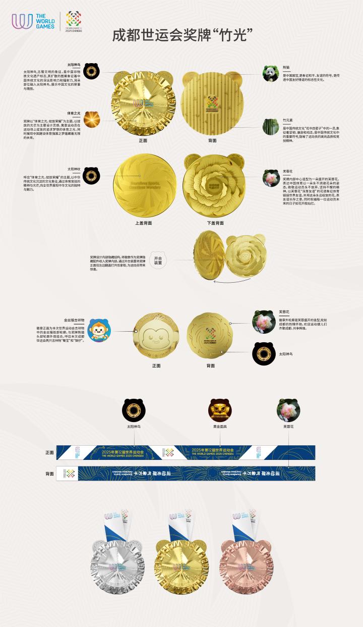 奖牌正面,首先跃入眼帘的是两只大熊猫“耳朵”,上面镌刻的金沙太阳神鸟纹饰展翅欲飞。奖牌流光溢彩,底部是层层光芒,彰显中华文明、巴蜀文化光辉璀璨;上面一层流动的凹凸造型是成都市域轮廓,居中的则是醒目的国际世运协会会徽,赛事中英文名称环绕呼应。