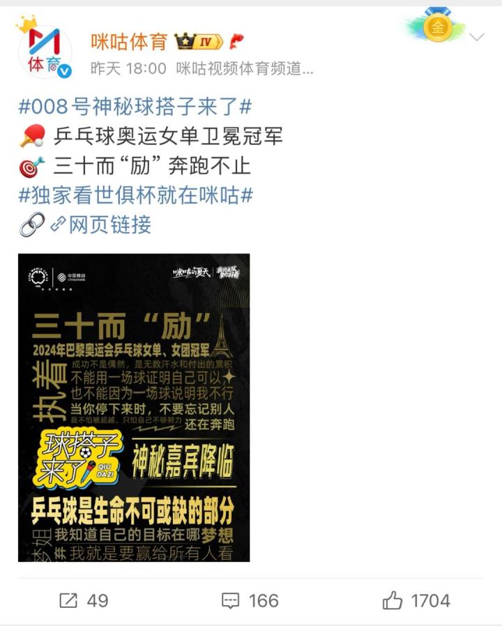 跨界!乒乓球奥运冠军陈梦将在咪咕解说世俱杯GSK @懂球帝2025-06-19 14:29北京时间6月18日,咪咕视频更新社媒,官宣乒乓球奥运冠军陈梦将作为“008号神秘球搭子”跨界解说世俱杯。此前,咪咕曾邀请乒乓球世界冠军樊振东、游泳运动员孙杨、演员赵奕欢、相声演员张九龄等参与跨界解说体验活动。展开更多