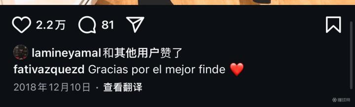 北京时间6月19日,据国外网友发现,亚马尔在13岁的时候就评论了和他传出绯闻女网红法蒂-巴斯克斯的社媒,距今已过去5年。