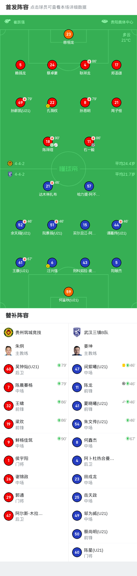 贵州筑城竞技2-1武汉三镇B队,陈祥煜传射,石一毅破门