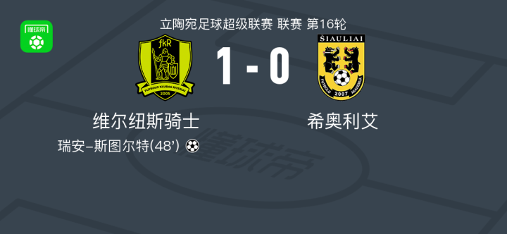 北京时间6月20日,立陶宛足球超级联赛第16轮,维尔纽斯骑士主场迎战希奥利艾。比赛中,瑞安-斯图尔特接奇维尔卡助攻完成破门,为维尔纽斯骑士打入制胜一球。最终,维尔纽斯骑士1-0战胜希奥利艾。