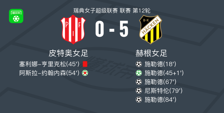 北京时间6月20日,瑞典女子超级联赛第12轮,皮特奥女足主场迎战赫根女足。比赛中,施勒德表现出色完成大四喜,尼斯特伦也有一球入账。此外,皮特奥女足在比赛中有一粒点球被阿斯拉-约翰内森罚丢,而塞利娜-亨里克松因严重犯规被红牌罚下。最终,赫根女足以5-0的比分战胜皮特奥女足。