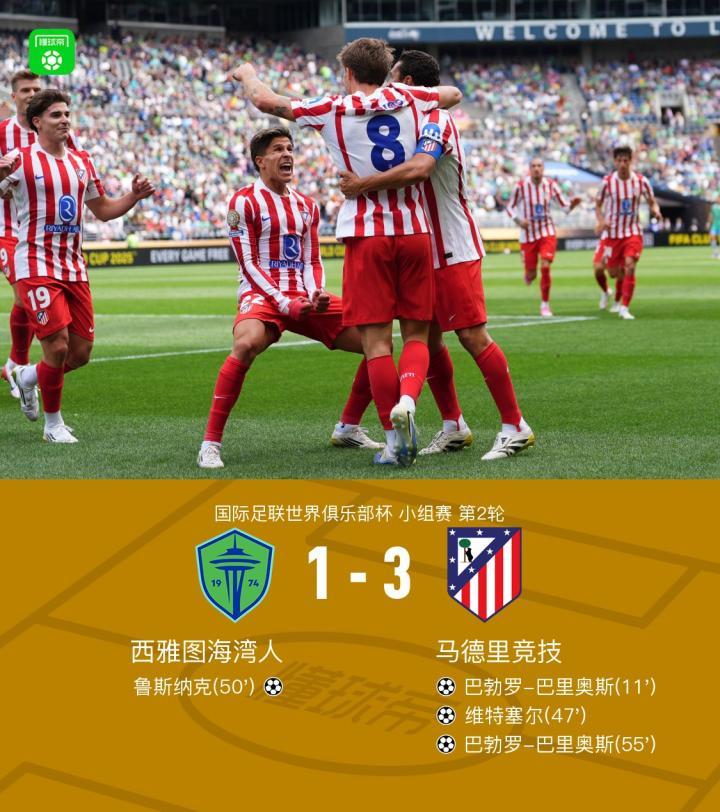 北京时间6月20日,国际足联世界俱乐部杯小组赛第2轮,西雅图海湾人与马德里竞技展开较量。上半场,朱利亚诺-西蒙尼送出助攻,巴勃罗-巴里奥斯成功取得进球。朱利亚诺-西蒙尼造点被吹。下半场,勒诺尔芒助攻维特塞尔破门将比分扩大。随后鲁斯纳克破门扳回一分。瑟洛特助攻,巴里奥斯破门完成双响。赫苏斯-费雷拉越位,进球被吹无效。最终,西雅图海湾人1-3不敌马竞,成为2025世俱杯首支被淘汰的队伍。