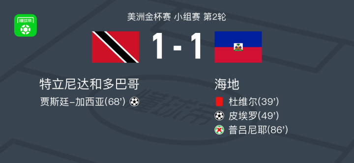 美洲金杯赛小组赛第二轮,特立尼达和多巴哥与海地展开较量。比赛中,海地一名队员因严重犯规被红牌罚下,这一决定对比赛走势产生了影响。随后,海地由皮埃罗率先打破僵局,为球队取得领先。特立尼达和多巴哥并未放弃,贾斯廷-加西亚凭借一次精妙的配合完成进球,将比分扳平。终场前,海地获得点球机会,但普吕尼耶未能把握住,最终双方以1-1握手言和。
