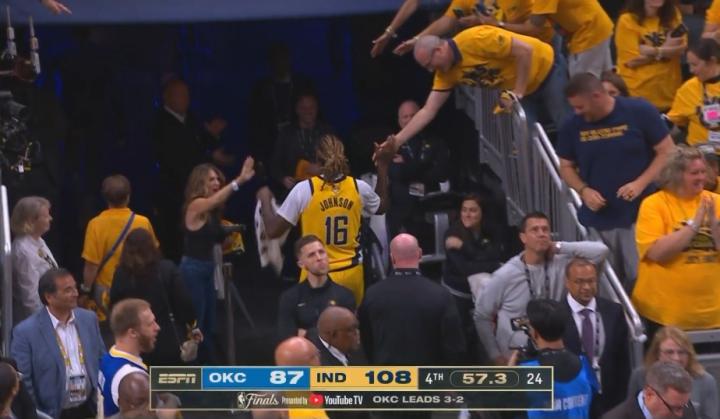本场比赛末节,在大局已定的情况下步行者派上了詹姆斯-约翰逊。值得一提的是,詹姆斯-约翰逊本赛季机会寥寥,他本人也以擅长“格斗”闻名。结果在登场2分钟后,约翰逊因为推搡了雷霆队的狄龙-琼斯而被直接驱逐出场。