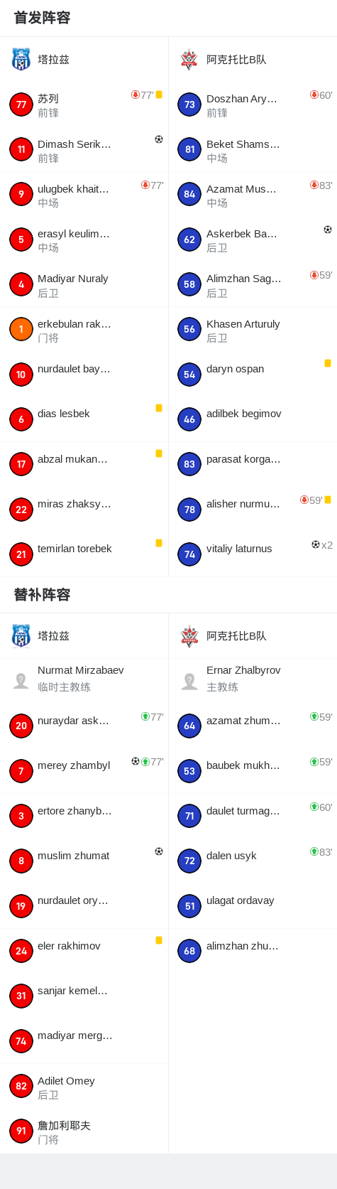 第73分钟,阿克托比B队球员vitaliy laturnus打入一球。