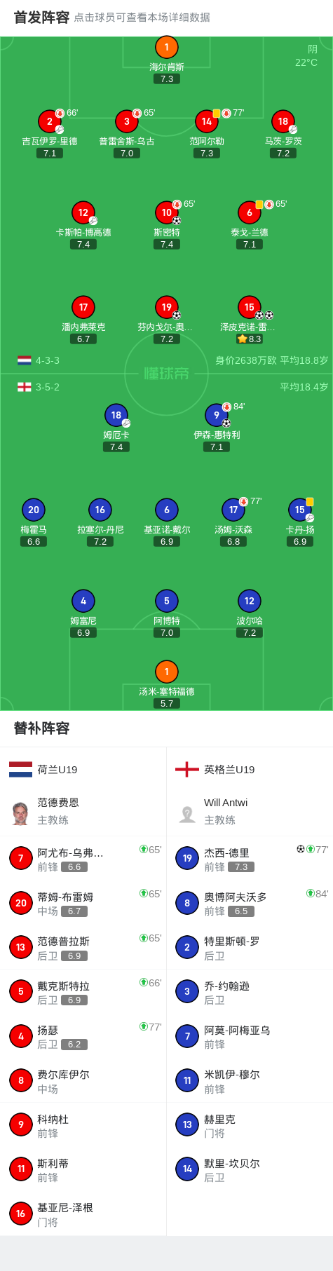 欧洲U19青年锦标赛小组赛,荷兰U19与英格兰U19展开较量。比赛中,斯密特为荷兰U19首开纪录,泽皮克诺-雷德蒙两度建功,芬内戈尔-奥夫-海塞林克也有进球入账。英格兰U19方面,伊森-惠特利和杰西-德里分别为球队扳回比分。最终,荷兰U19以4-2战胜英格兰U19。