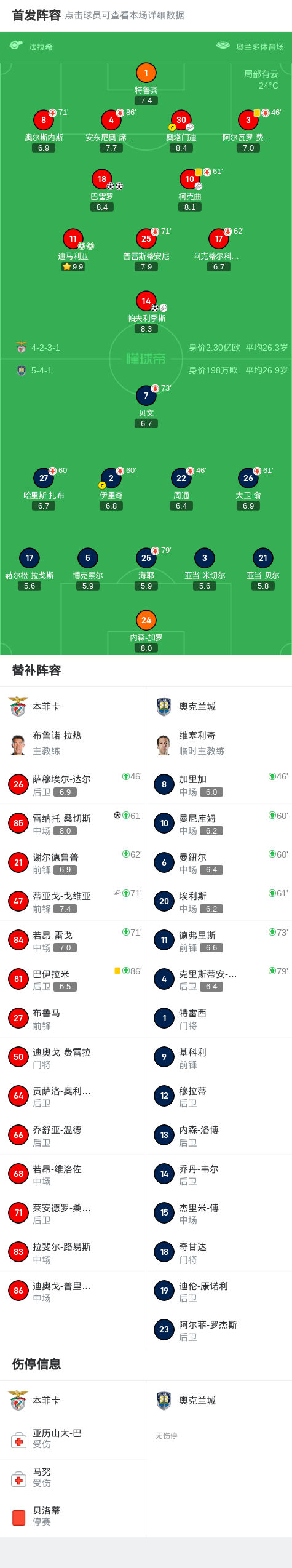 本菲卡6-0狂胜奥克兰城,迪马利亚双响,巴雷罗梅开二度战报bot @懂球帝2025-06-21 04:18北京时间6月21日国际足联世界俱乐部杯小组赛第2轮,本菲卡对阵奥克兰城。本菲卡迪马利亚梅开二度,帕夫利季斯传射建功,雷纳托-桑切斯破门,巴雷罗梅开二度。最终比分本菲卡6-0完胜奥克兰城。点击查看本场比赛详细数据>>点击查看世俱杯完整积分榜>>球队阵容技术统计展开更多