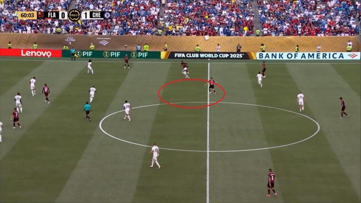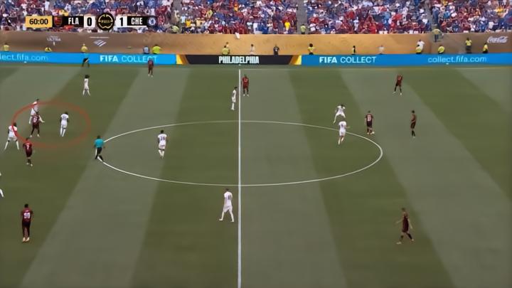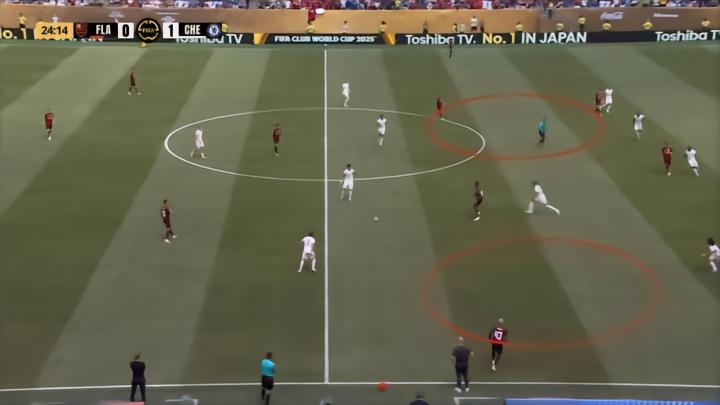 尽管幸运地取得了比分的领先,但这必定不是马雷斯卡所设想的比赛进程,因为切尔西的前场压迫强度并不高,这导致弗拉门戈在比分落后时也可以轻松发现边路的空当: