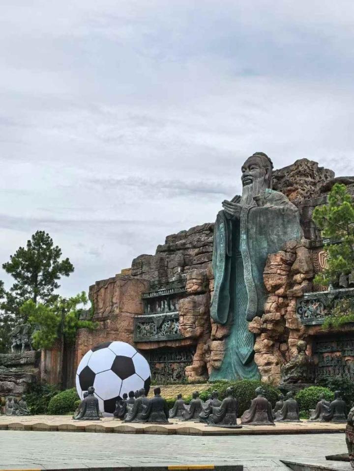 据新华报业网的消息,在春秋淹城景区,工作人员在孔子像前精心放置了一个足球。现代足球与千年文脉形成奇妙对话,孔子凝视足球的眼神被网友解读为“对进球的渴望”。天宁宝塔前的鎏金足球更成为新晋网红打卡点。