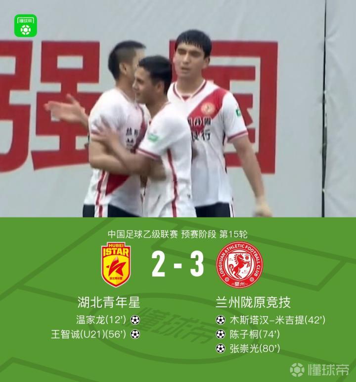 北京时间6月21日中国足球乙级联赛 预赛阶段 第15轮,湖北青年星主场对阵兰州陇原竞技。湖北青年星温家龙、王智诚破门帮助球队两度领先。兰州陇原竞技木斯塔汉-米吉提、陈子桐帮助球队两度扳平,张崇光打入制胜球。最终比分湖北青年星 2-3 兰州陇原竞技。