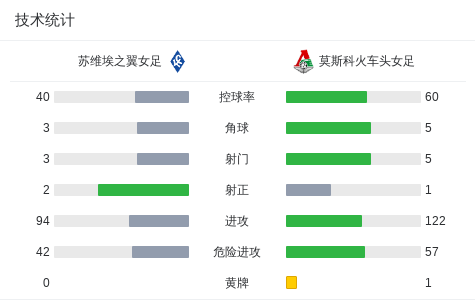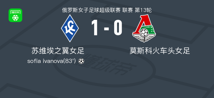 苏维埃之翼女足1-0莫斯科火车头女足,sofia ivanova绝杀战报bot @懂球帝2025-06-21 20:25北京时间6月21日,俄罗斯女子足球超级联赛第13轮,苏维埃之翼女足主场迎战莫斯科火车头女足。比赛中,苏维埃之翼女足由sofia ivanova打入制胜一球。最终,苏维埃之翼女足以1-0战胜莫斯科火车头女足。点击查看本场比赛详细数据>>点击查看俄女超完整积分榜>>精彩瞬间第83分钟,苏维埃之翼女足球员sofia ivanova打入一球。 技术统计 展开更多